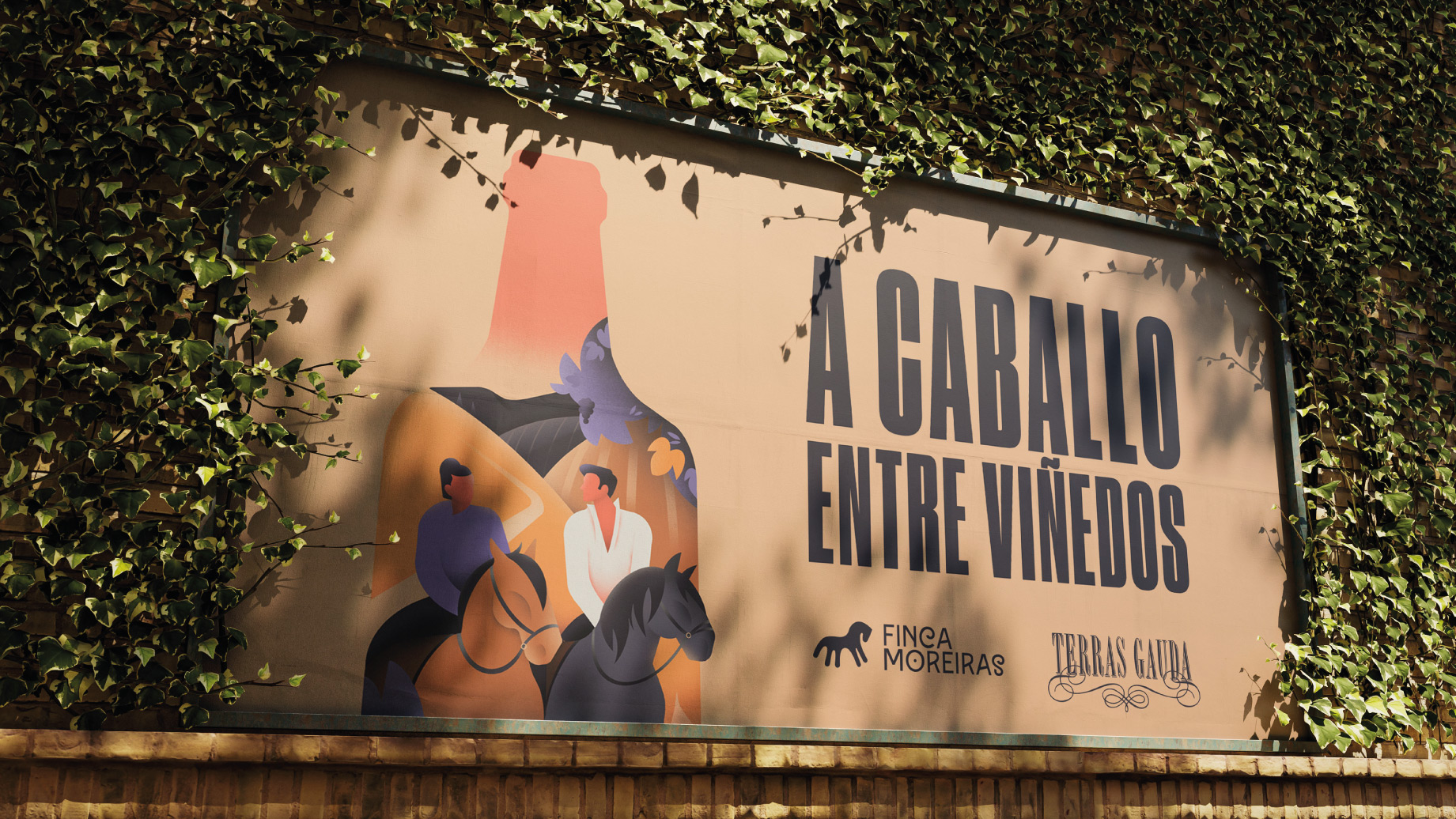 Cartelería ilustrada para promover la colaboración entre Finca Moreiras y la bodega de vinos Terras Gauda, con denominación de origen en las Rías Baixas. “A caballo entre viñedos” son rutas a caballo a través de las viñas de las bodegas, elevando la experiencia de una cata de vinos tradicional.